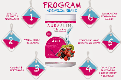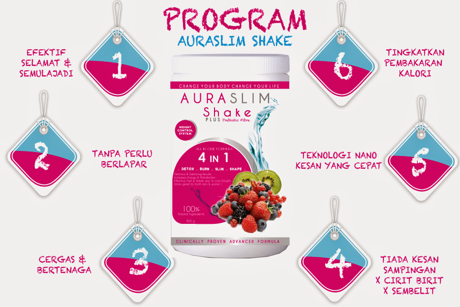 Program Aura Slim Shake berfungsi dengan mengawal jumlah kalori dan karbohidrat secara keseluruhan di dalam tubuh badan. Pribaiotik Fiber yang terkandung di dalam Aura Slim Shake dapat membantu mengurangkan lemak di dalam darah dan melawas kan proses pembuangan toxin di dalam badan. Dapat menyerap segala khasiat dan vitamin dengan mudah. Khusus untuk perlansingan dan kecantikan kulit.